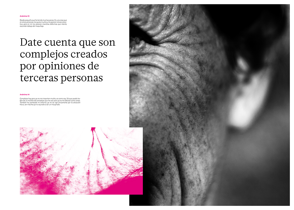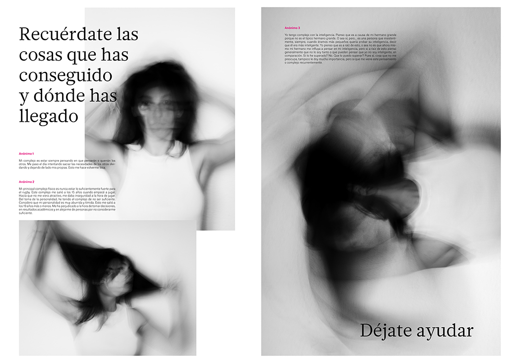 Los complejos no solo son un problema de adolescencia que surge por la falta de popularidad, sino que este pequeño complejo puede marcar la vida, la personalidad y el carácter de cada individuo generando un trauma. En este estudio se retratan los complejos físicos y psíquicos, tanto los más comunes como los más extraños, acompañados de la aportación de historias personales para poner en manifiesto los traumas que ha generado una sociedad marcada por la crítica y las expectativas irreales. Utiliza la fotografía como herramienta de cura, permite descomplejarse y empoderarse. Produce una maximización de los complejos para dignificarlos y así minimizarlos y normalizarlos.